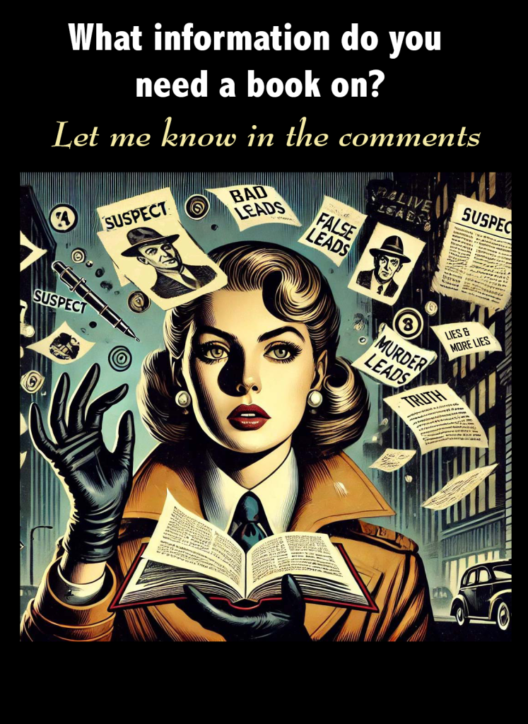 This page is in process but I guarantee that by the time I’m finished there will be something here for everyone who wants to write or create a mystery story.