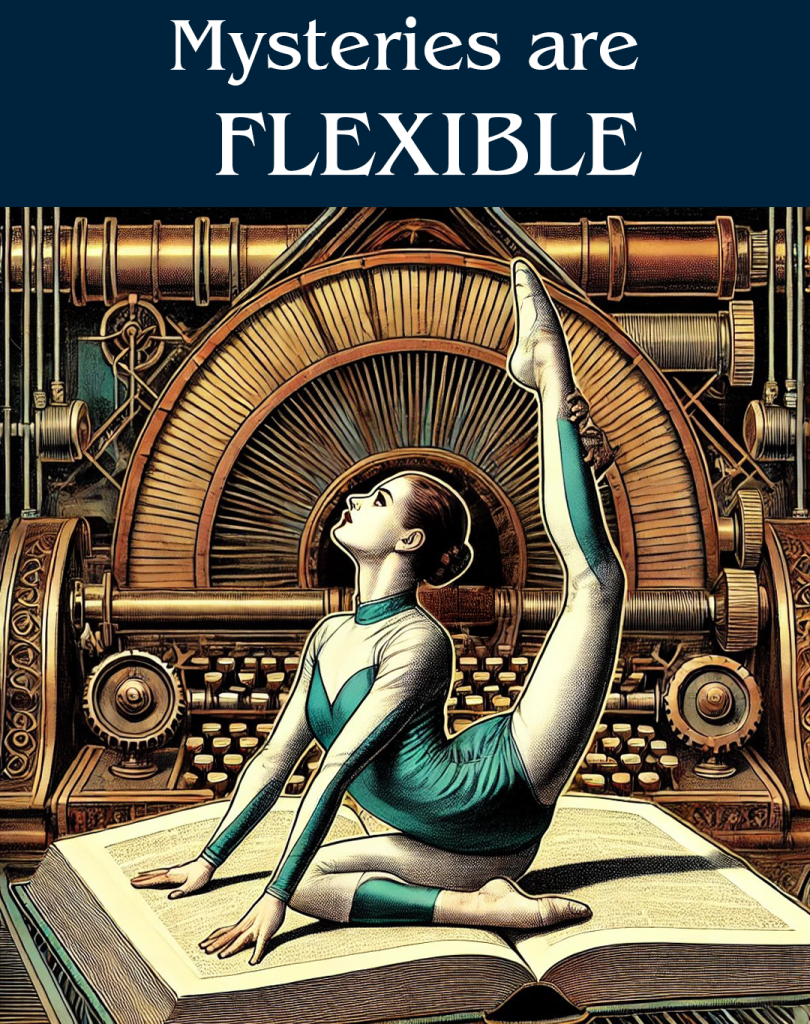 Mysteries are flexible, fitting any situation. For interactive scripts, know your constraints up front to avoid adjustments later. For books, you have more freedom but still need a clear endpoint. Build a strong infrastructure to support all twists. The Mystery Bones Diagrams helps track your plot and allow you to follow promising new ideas within reason. If an idea requires major changes, it might be a different story altogether.
