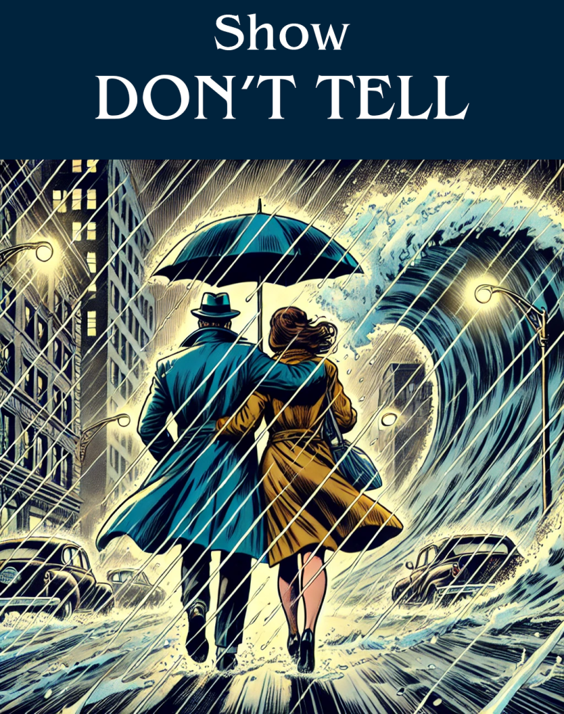 “Don’t just say it’s raining – make us feel the sodden weight of a wall of water driven by winds at sixty miles an hour.”